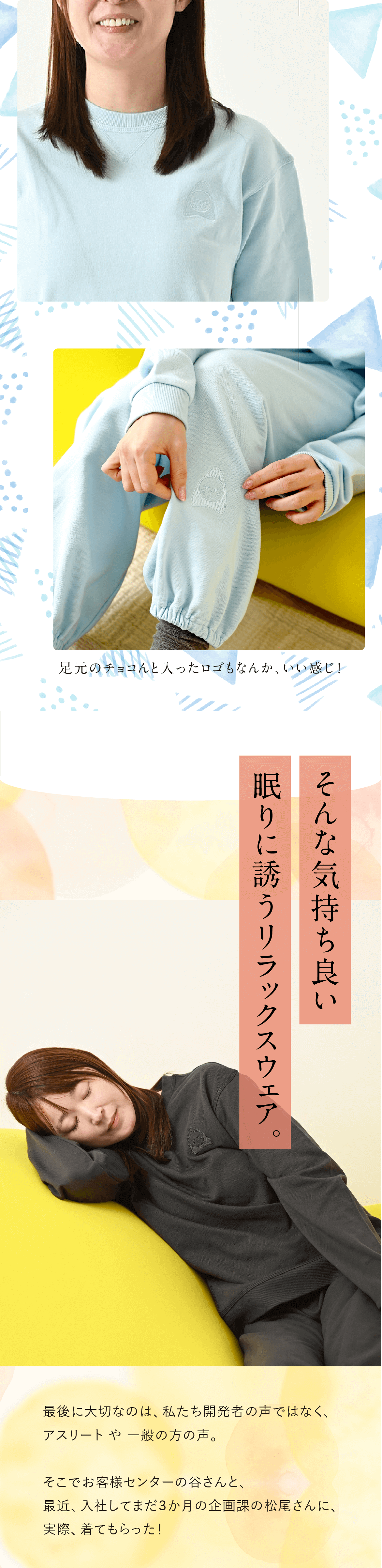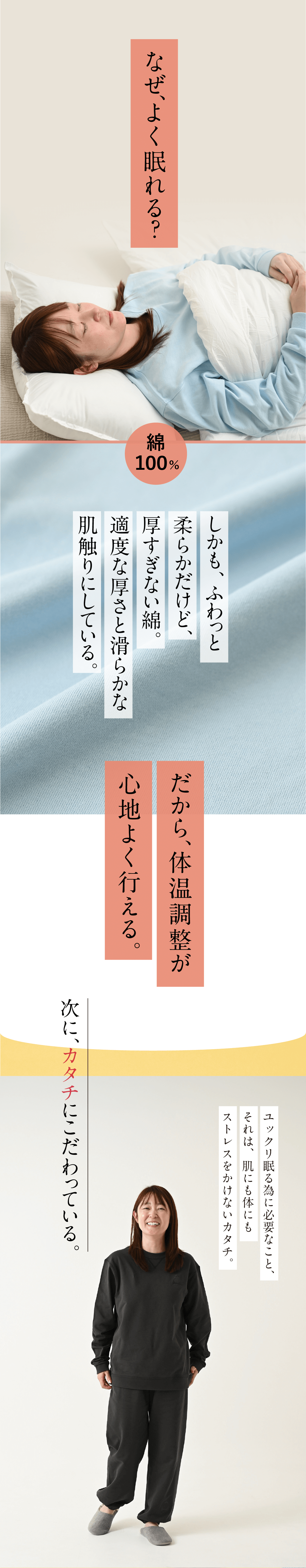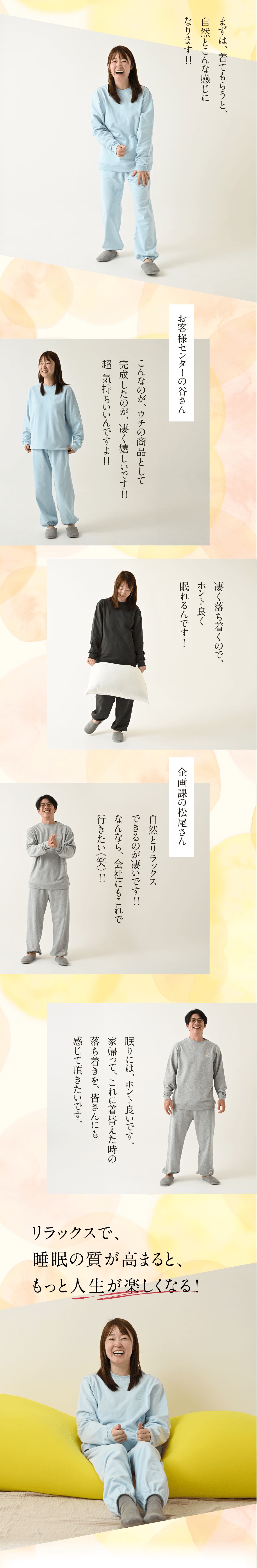 年齢、ご状況問わずにご活用頂きたいですが、とにかく良く眠りたい方、睡眠の質を大切にしている方、ストレスフルな環境で 体に負担をかけている方、自分に合ったリラックスウェアをお探しの方には、特にオススメです。