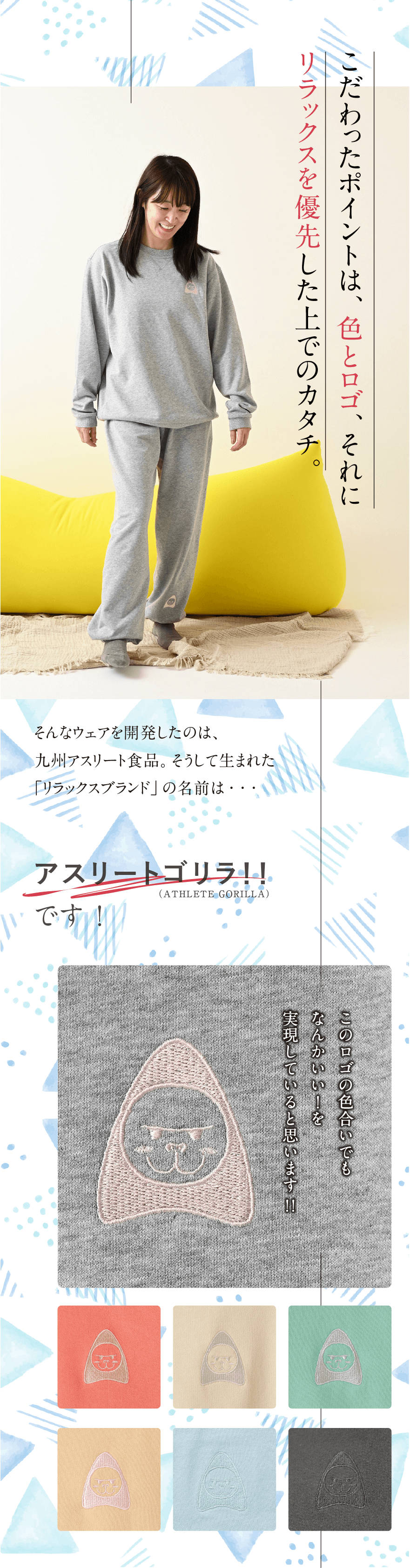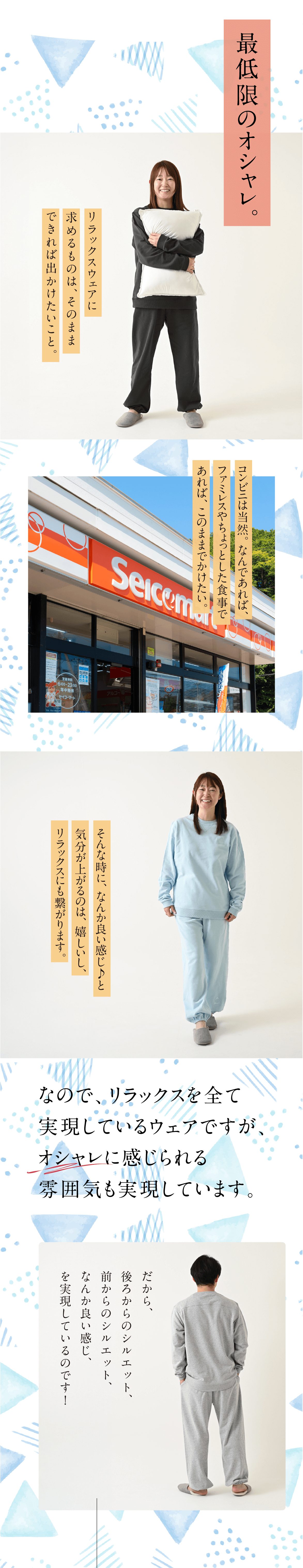 睡眠時、リラックス時はもちろんですが、移動時(コンビニや、ファミレスやちょっとしたお食事)にも、そのまま出かけて頂けるよう最低限のオシャレさも大切にしております。