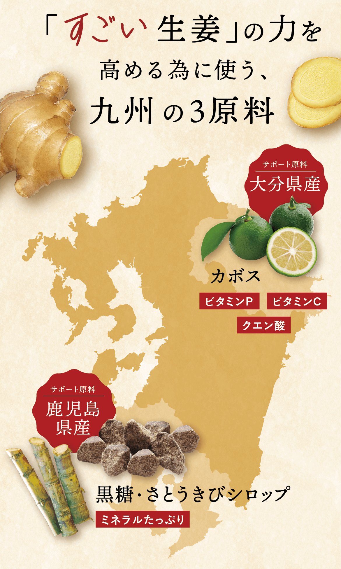 生姜(長崎県産)、黒糖(鹿児島県産)、かぼす果汁(大分県産)、さとうきびシロップ(鹿児島県産)