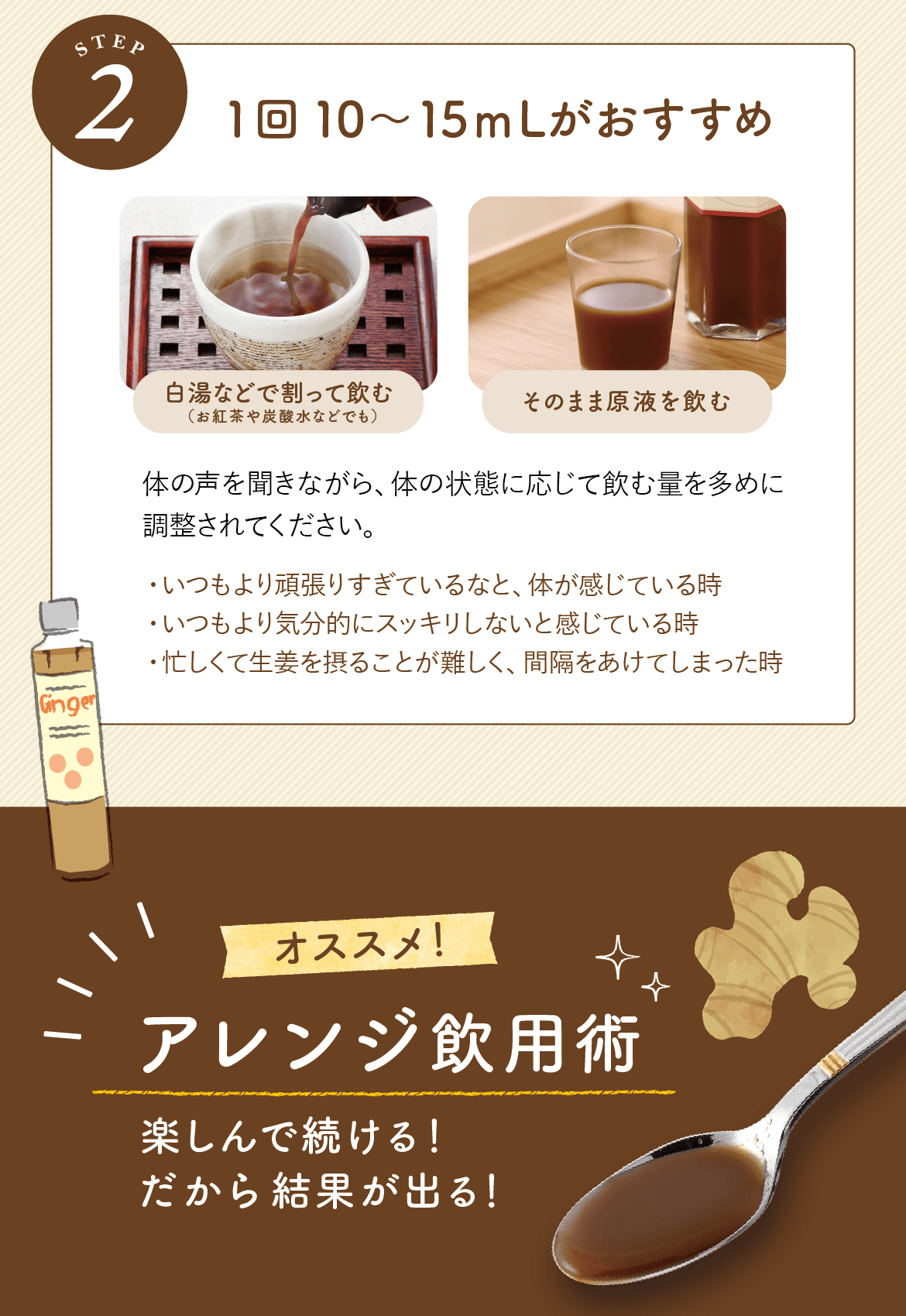 1日10潤オ15mLを目安に、原液のままか、水またはお湯等に 混ぜてお召し上がりください。お料理にもお使いいただけます。